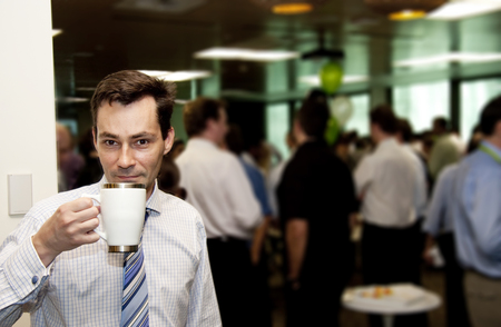 48695789 – a business man gets a wake me up coffee hit during a conference morning tea break