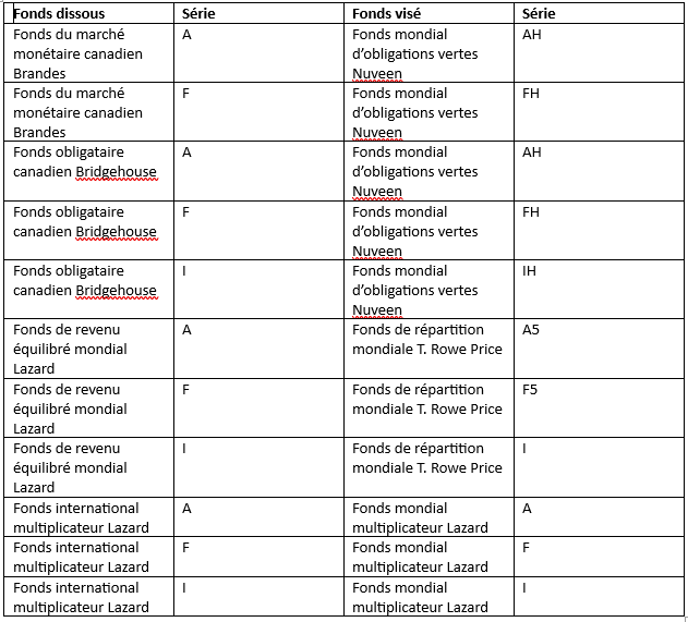 De plus, le 8 mai prochain, le Fonds du marché monétaire canadien Brandes, le Fonds obligataire canadien Bridgehouse, le Fonds de revenu équilibré mondial Lazard et le Fonds international multiplicateur Lazard seront dissous.